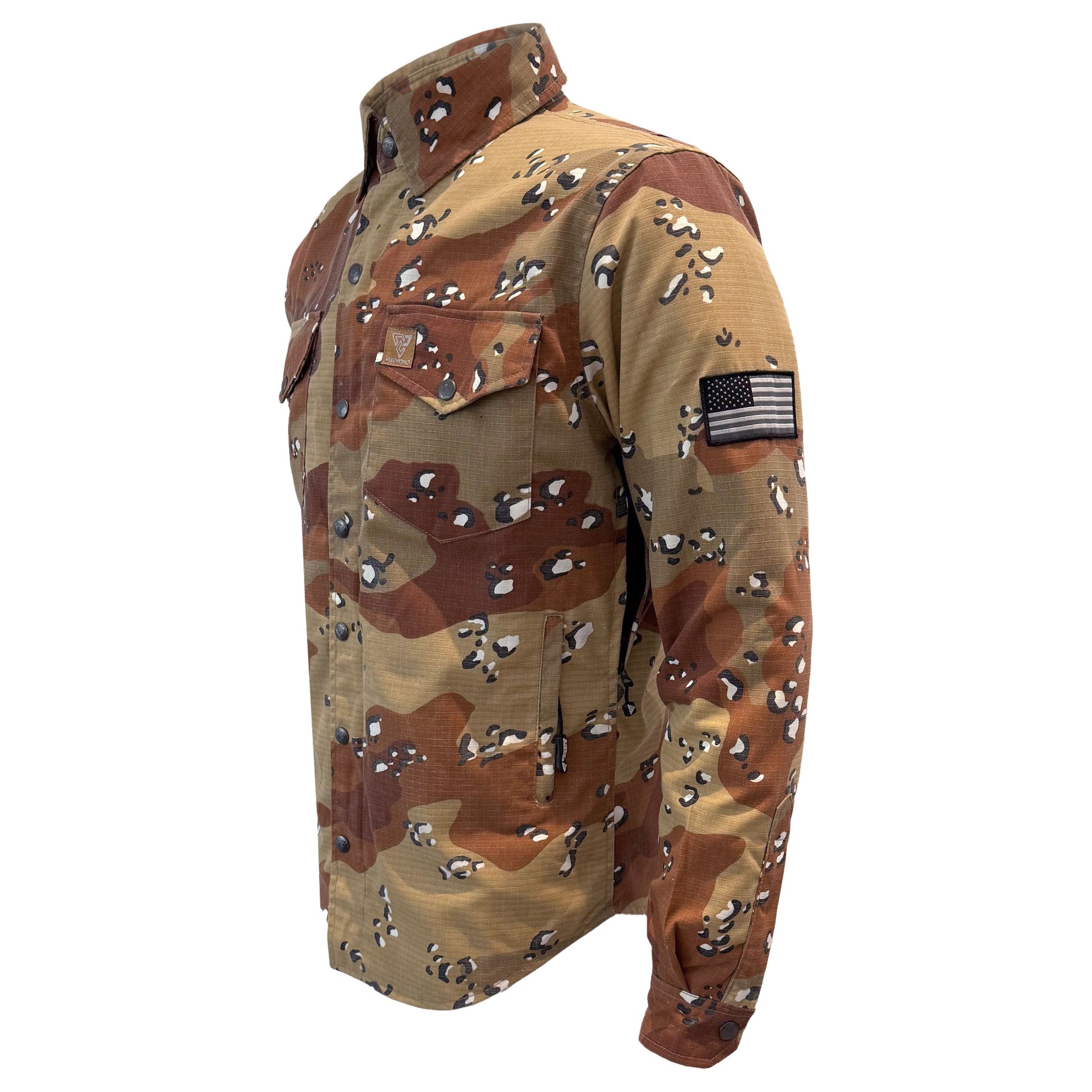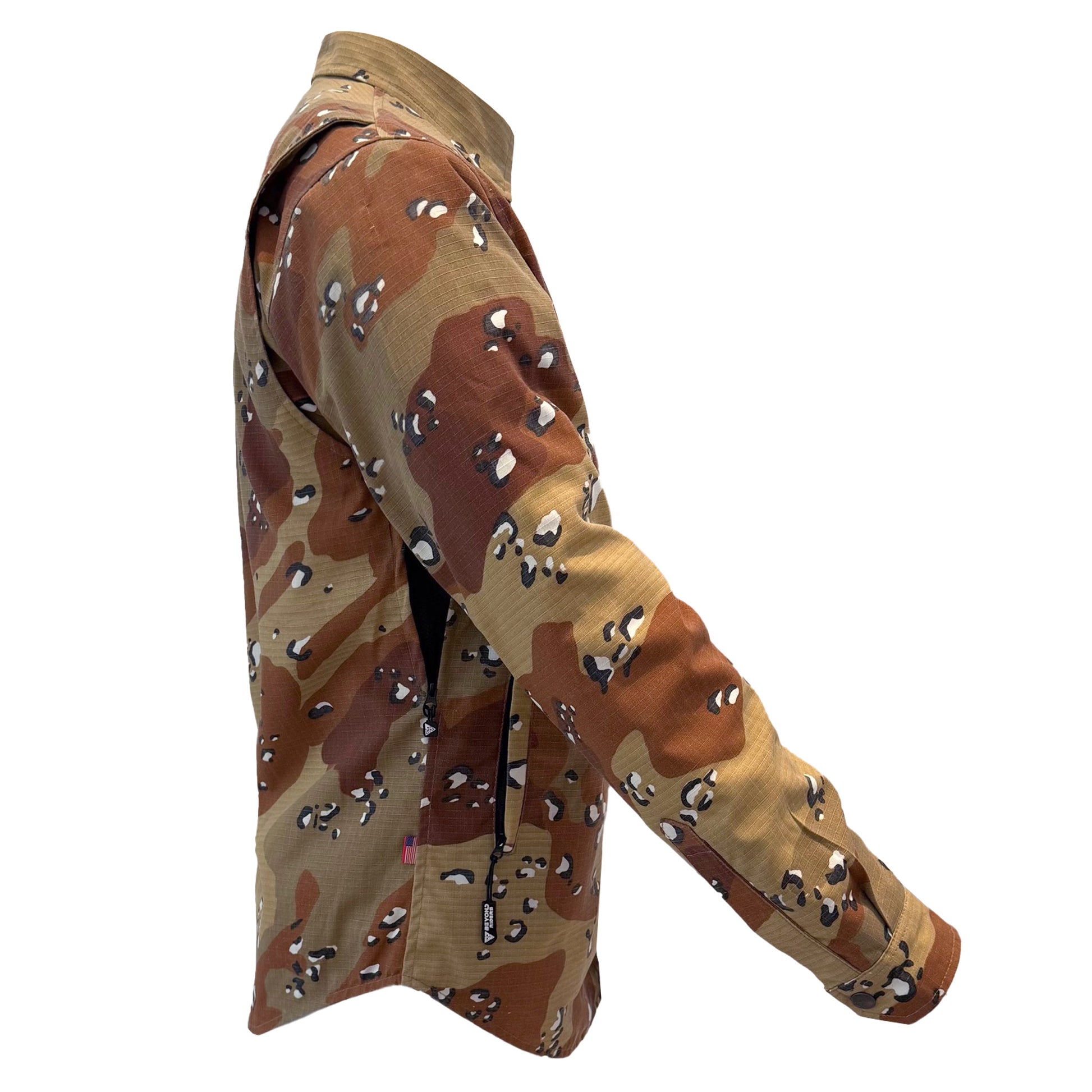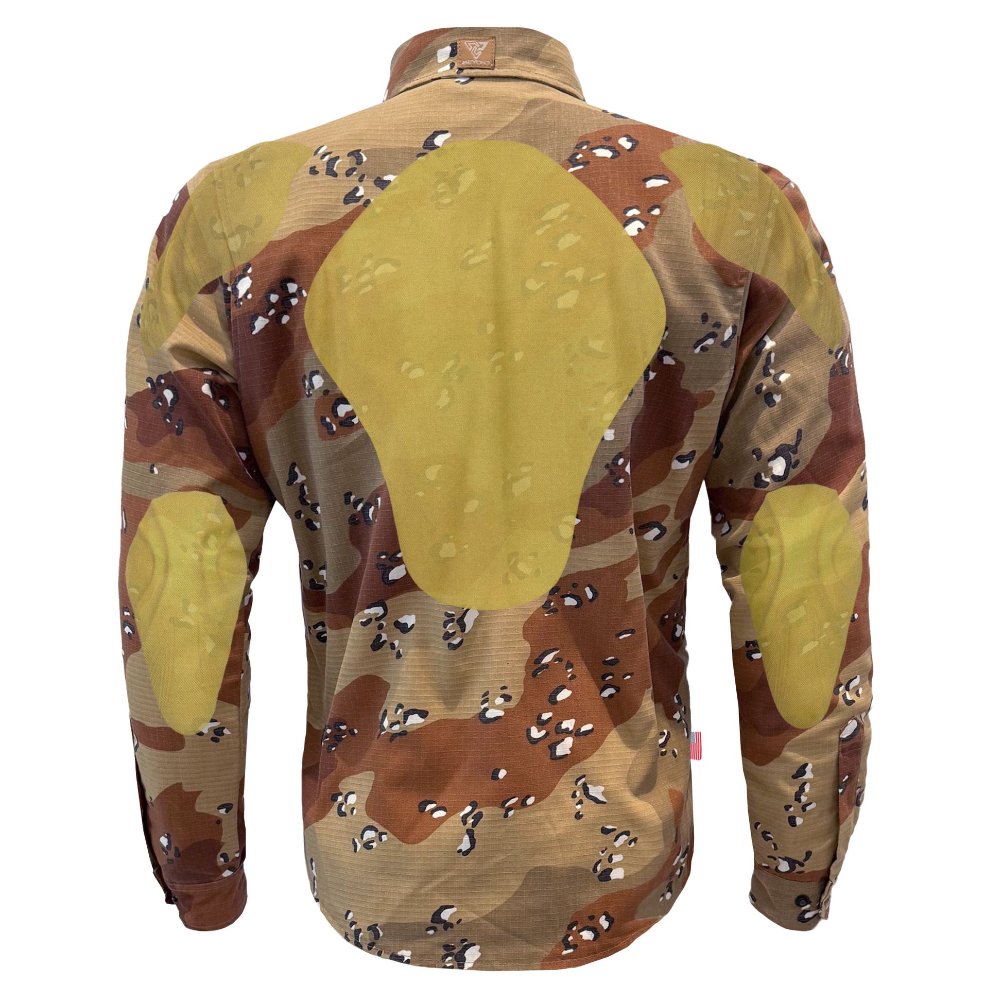 Dive into the rugged world of riding with the "Dagger Two" Desert Protective Camouflage Shirt with Level 1 pads included for men. Meticulously crafted for those who seek adventure, this shirt combines a unique camouflage aesthetic with a full Kevlar lining, offering unparalleled protection and comfort. Made from a robust 60% Polyester and 40% Cotton blend, it's the ultimate shield for the bold male rider who values both style and comprehensive safety.