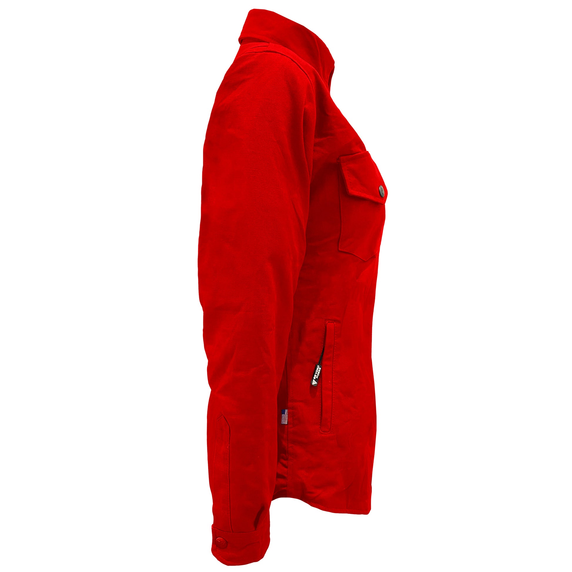 The Protective Canvas Jacket for Women in Red with Level 1 pads included stands at the intersection of classic design and modern rider safety. It's an ideal choice for those seeking motorcycle protective gear that doesn't compromise on fashion. Whether cruising urban landscapes or adventuring on open roads, this jacket ensures you're stylishly equipped and protected. Order now and ride with confidence and elegance.
