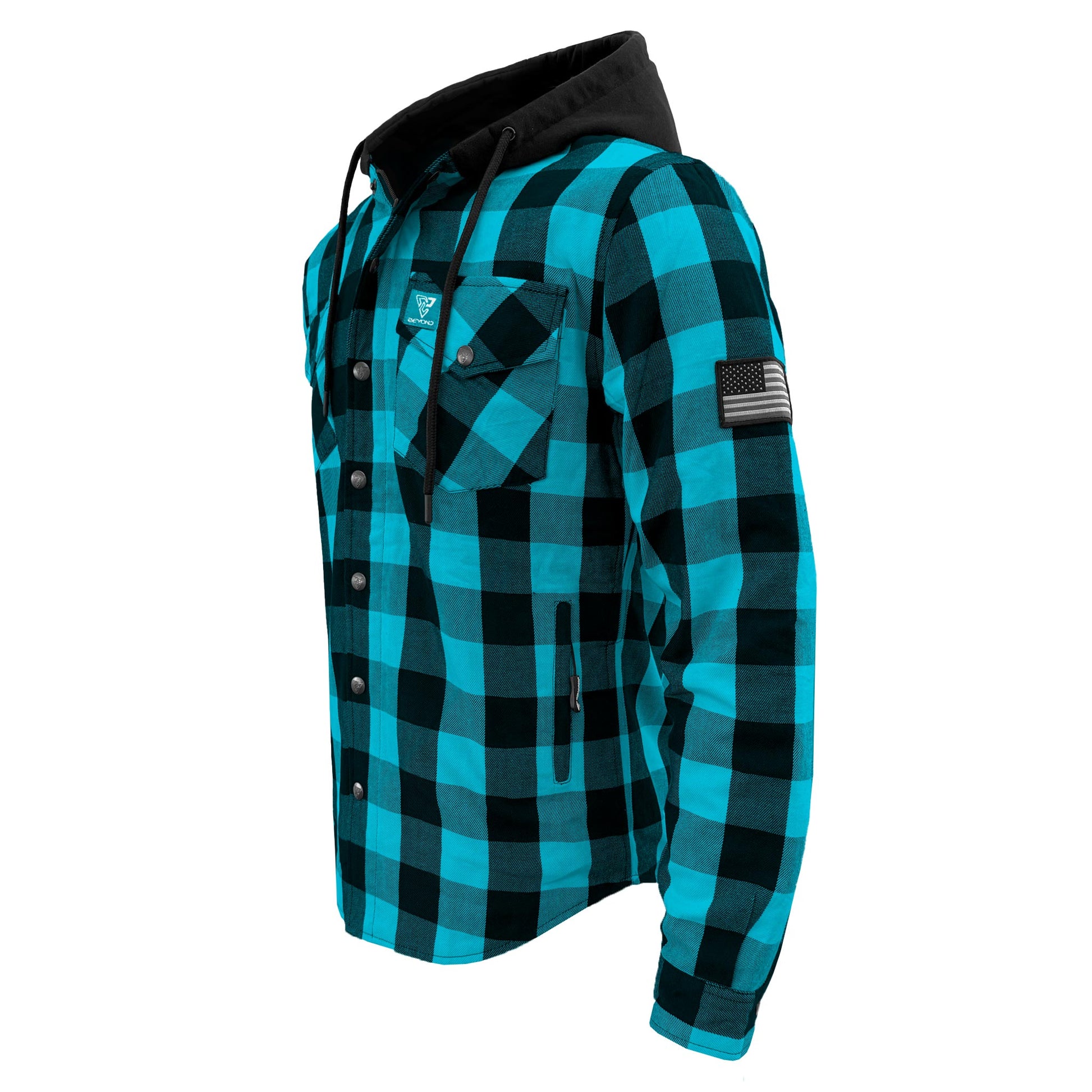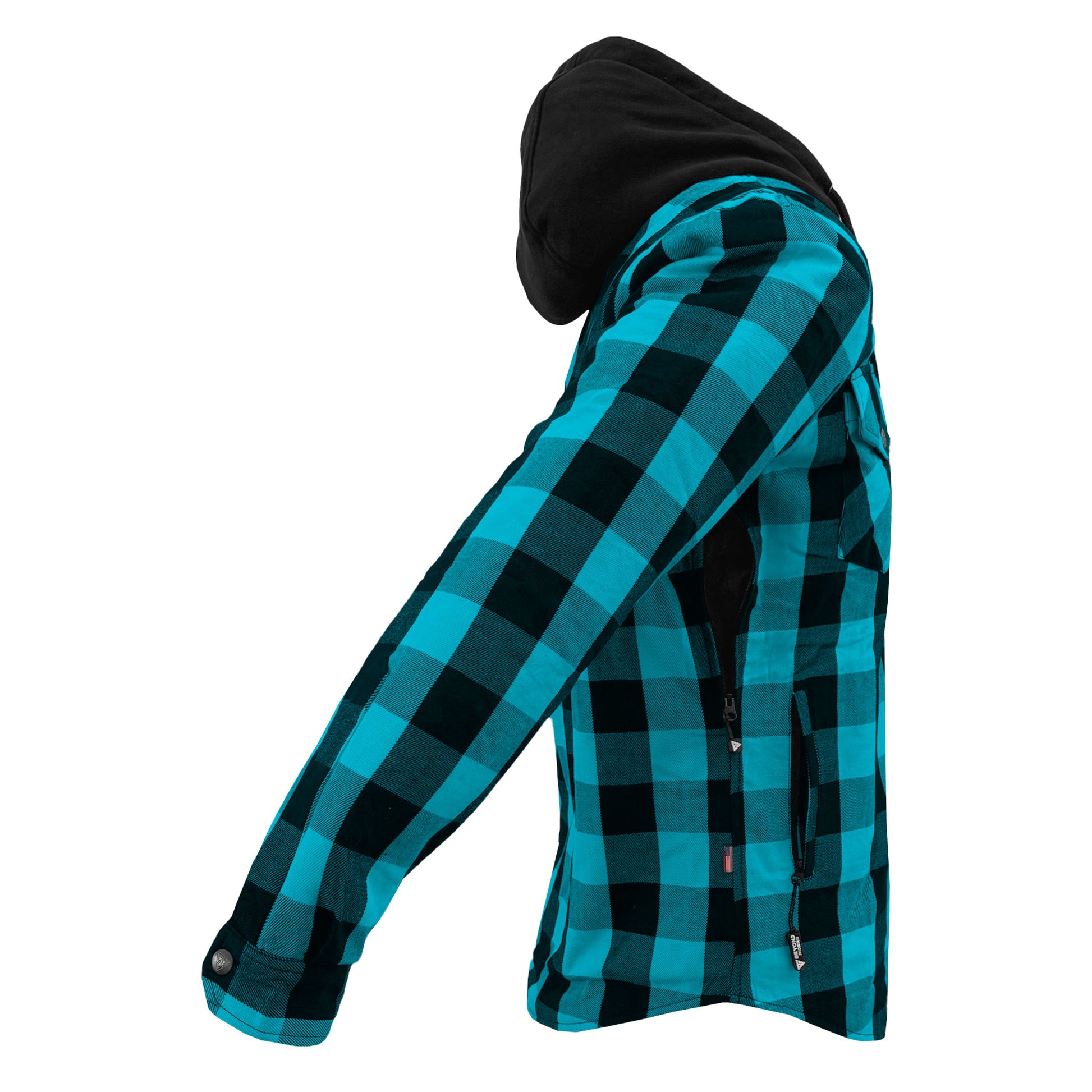 Find your perfect blend of style and safety with the Men's Protective Flannel Hoodie in Aqua Blue & Black Checkered & Black Fleece Hood with Level 1 pads included. This Beyond Riders' selection is for those who navigate life's journeys with a keen sense of style and a high regard for protection. Ideal for the motorcycle or PEV rider who values a look that’s as versatile as their lifestyle.