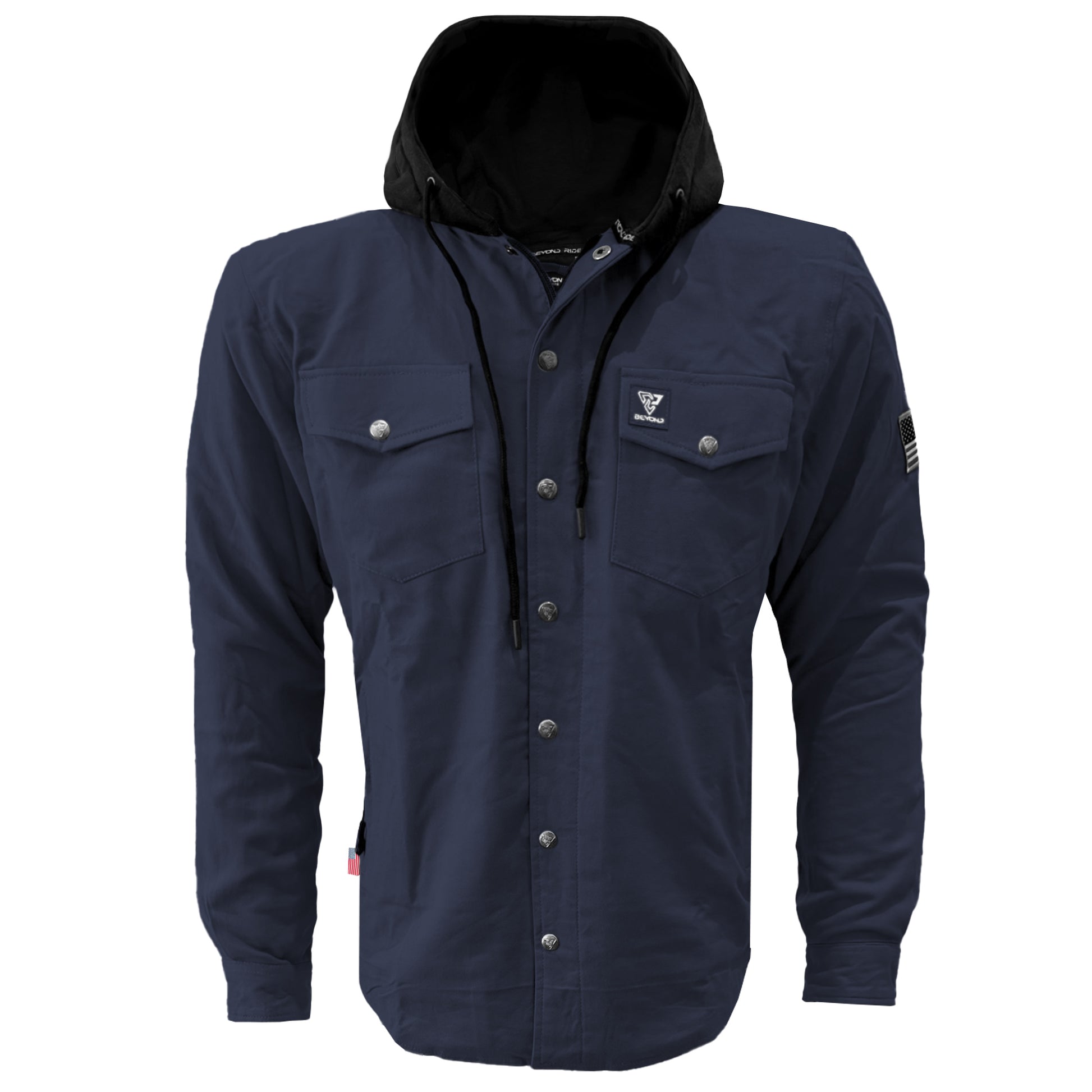 Find your perfect blend of style and safety with the Men's Protective Flannel Hoodie in Navy Blue Solid & Black Fleece Hood with Level 1 pads included. This Beyond Riders' selection is for those who navigate life's journeys with a keen sense of style and a high regard for protection. Ideal for the motorcycle or PEV rider who values a look that’s as versatile as their lifestyle.