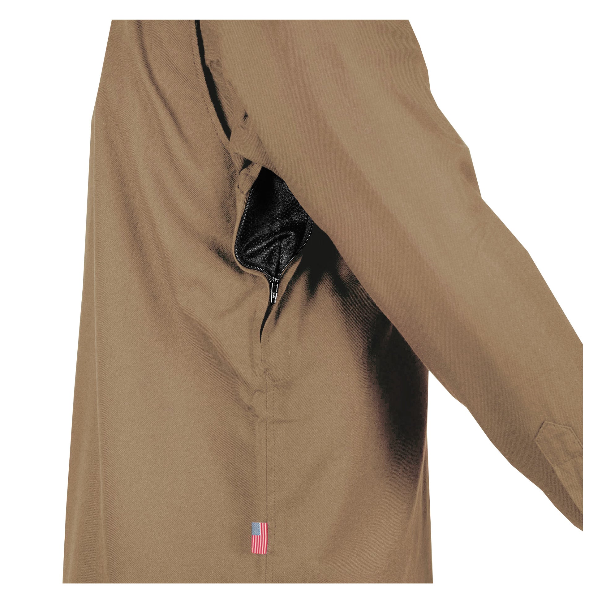 - The shirt's construction naturally resists abrasion, supported by pocket placements for CE-approved protective inserts.
