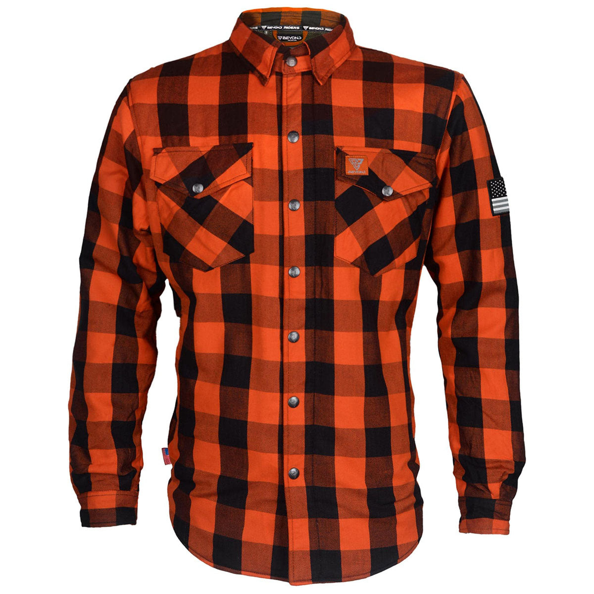 Embrace the spirit of fall rides with the Men's Protective Flannel Shirt "Autumn Blast" in Orange and Black Checkered with Level 1 pads included from Beyond Riders. Designed for those who ride with vibrancy, this shirt combines the warmth of autumnal colors with steadfast protection, perfect for motorcycle and PEV riders seeking to stand out and stay safe.