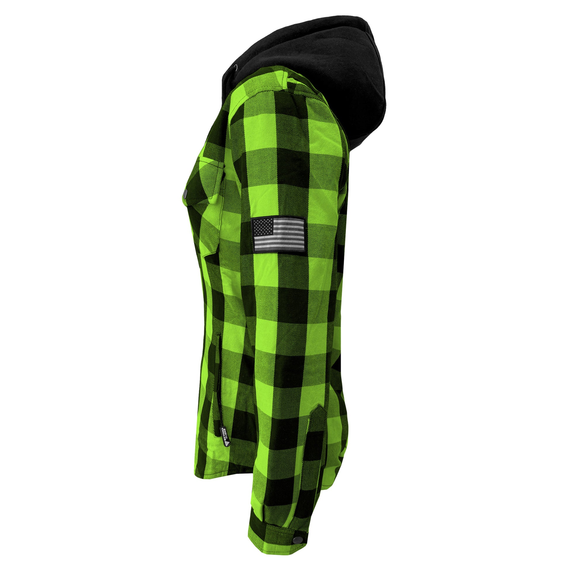 Find your perfect blend of style and safety with the SALE Women's Protective Flannel Hoodie in Green & Black Checkered & Black Fleece Hood with Level 1 pads included. This Beyond Riders' selection is for those who navigate life's journeys with a keen sense of style and a high regard for protection. Ideal for the motorcycle or PEV rider who values a look that’s as versatile as their lifestyle.