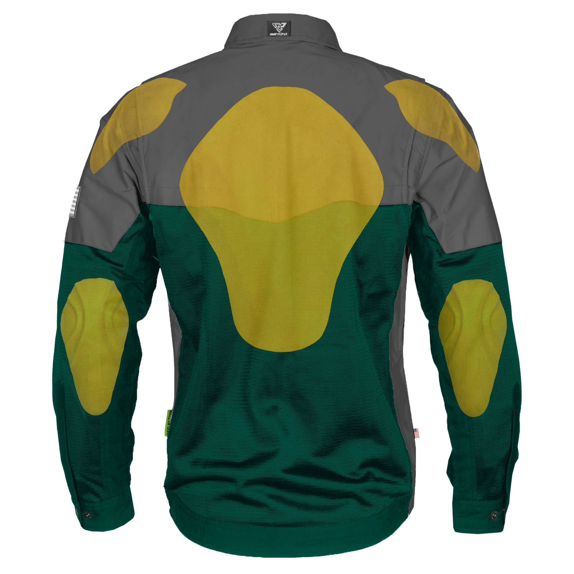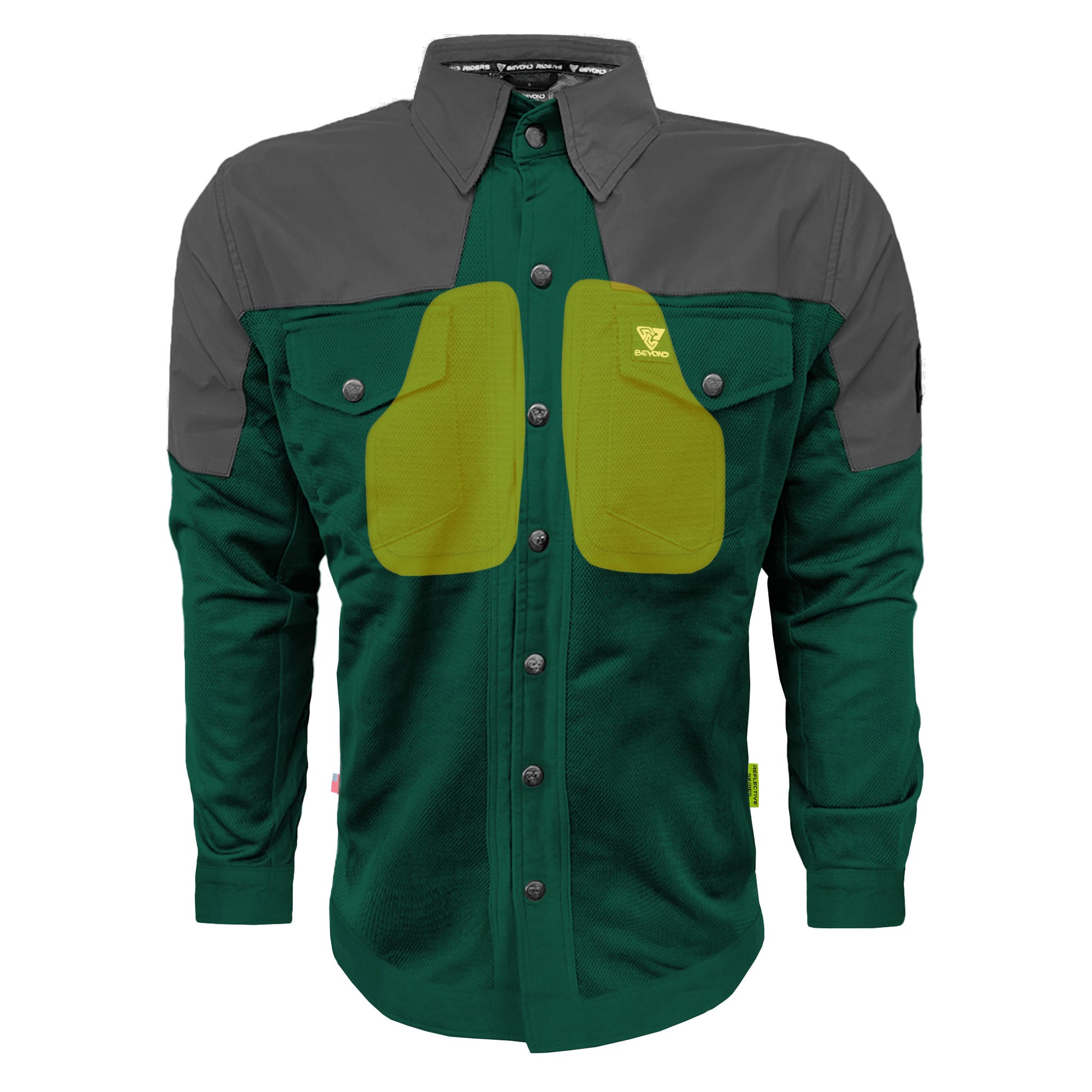 Ride with the allure of summer nights. Beyond Riders Dark Green Nebula Shirt with Level 1 pads included blends American style with top-tier protection. Ideal for hot days, it offers cool comfort, and its reflective design shines during nighttime rides for added safety.