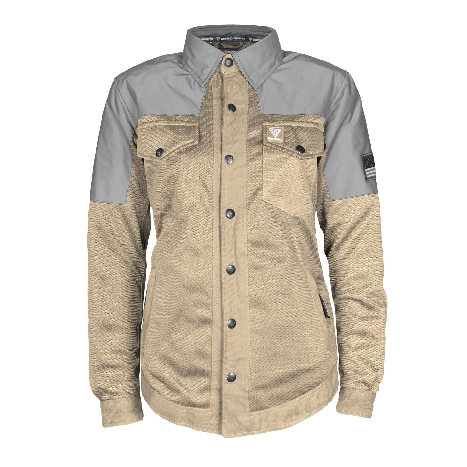 Introducing the latest innovation in rider safety and comfort - the Summer MESH Reflective Shirt Khaki Eclipse for Women - with Level 1 pads Free Chest Pads Level 2 included. Beyond Riders proudly presents a shirt that's not just an apparel but a commitment to safety, especially designed for those who love to ride into the night.