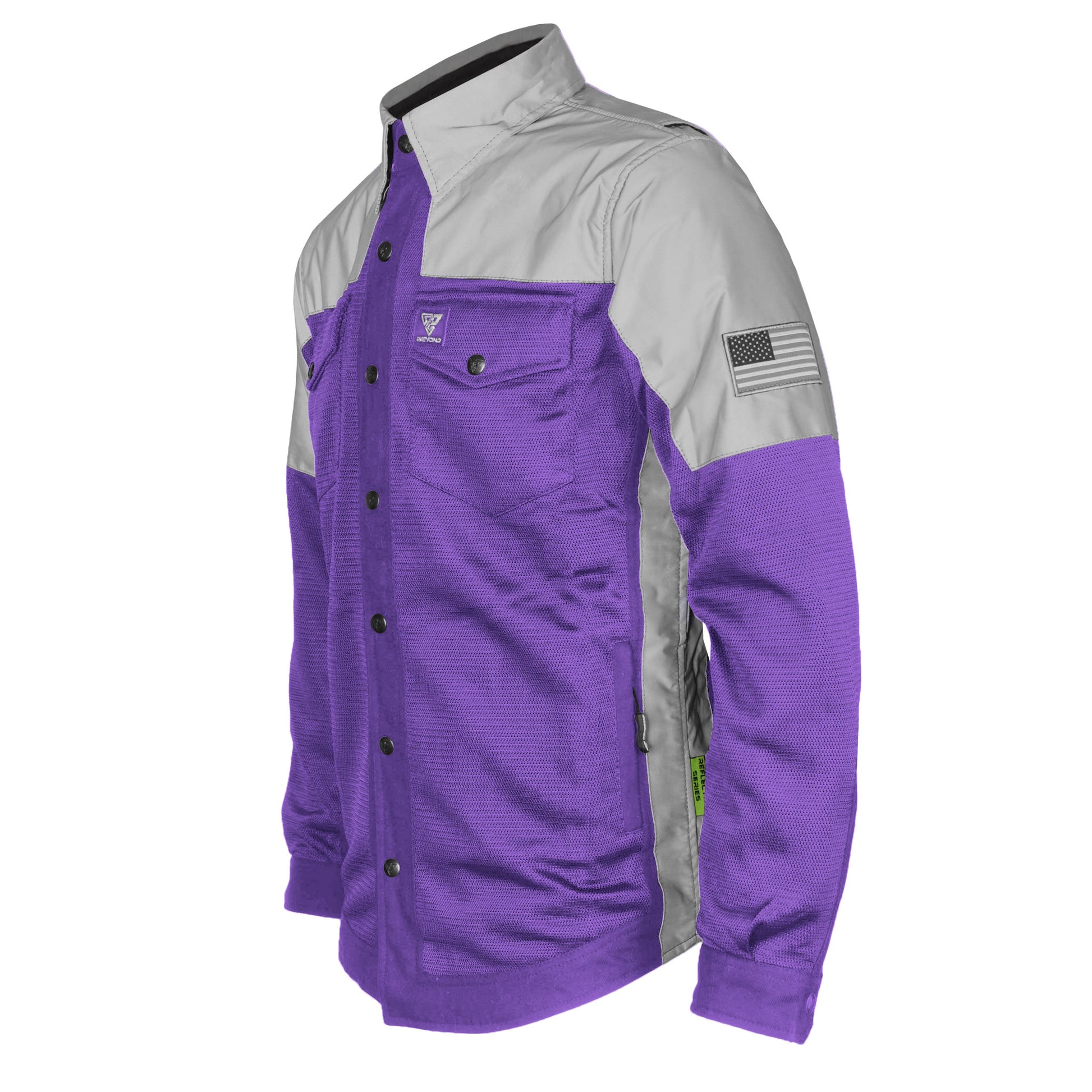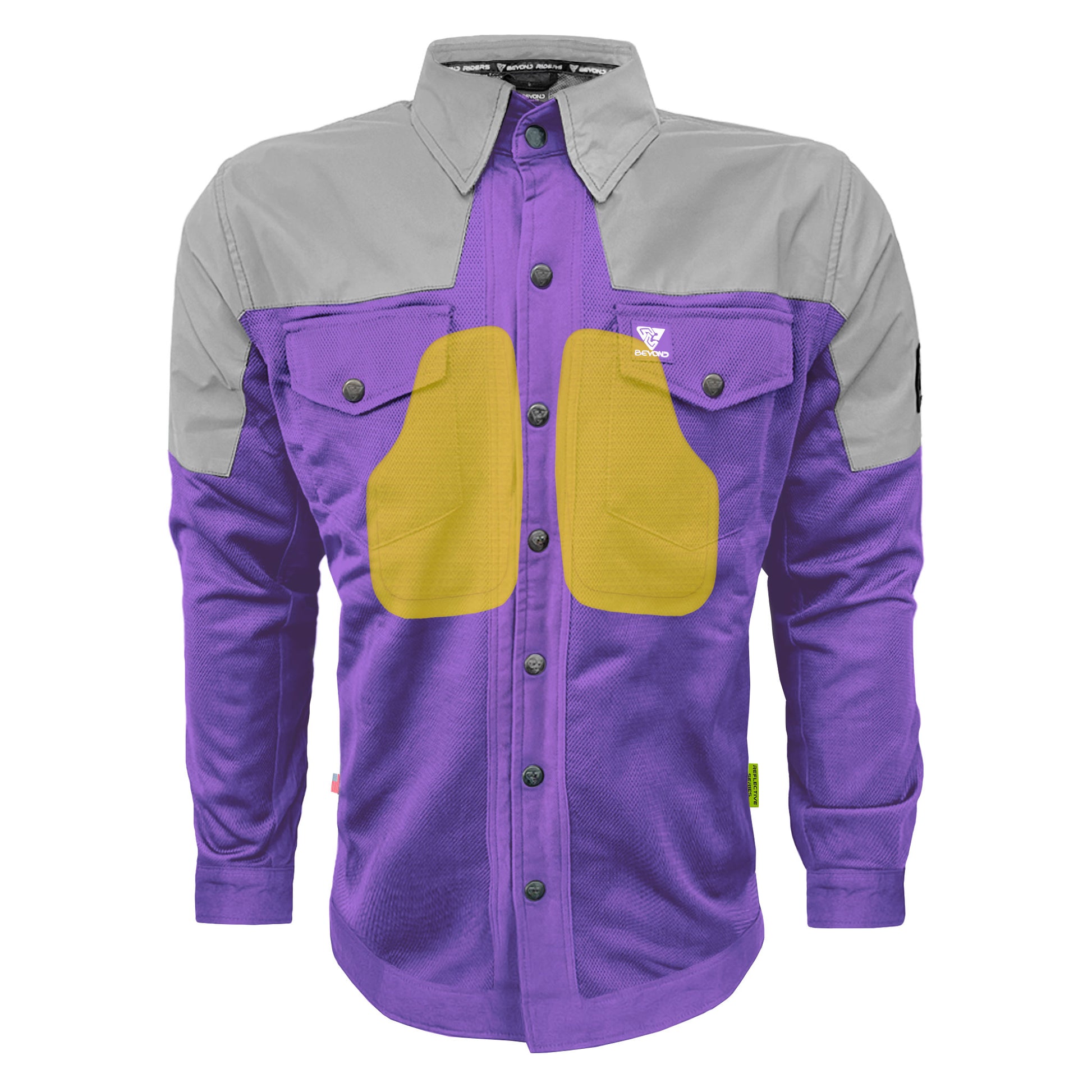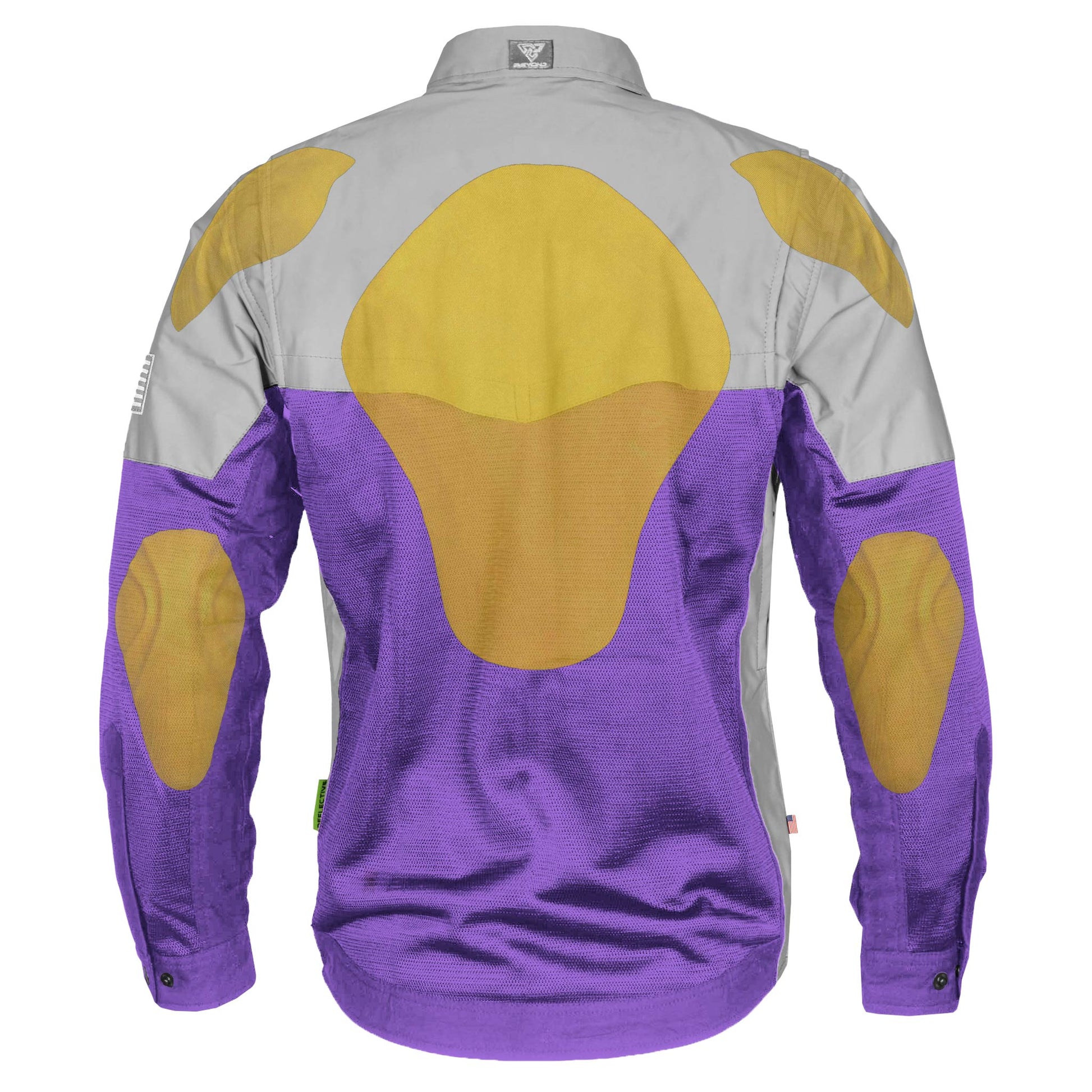 Ride with the allure of summer nights. Beyond Riders Purple Eclipse Shirt with Level 1 pads included blends American style with top-tier protection. Ideal for hot days, it offers cool comfort, and its reflective design shines during nighttime rides for added safety.