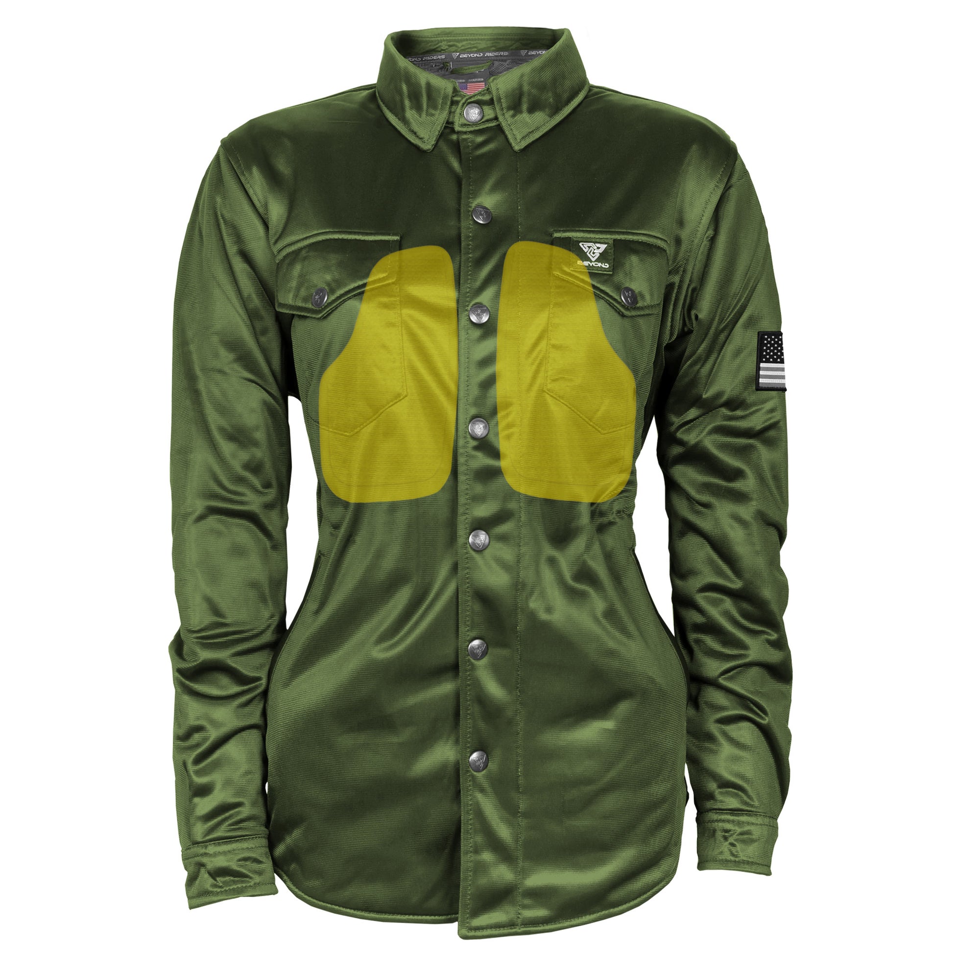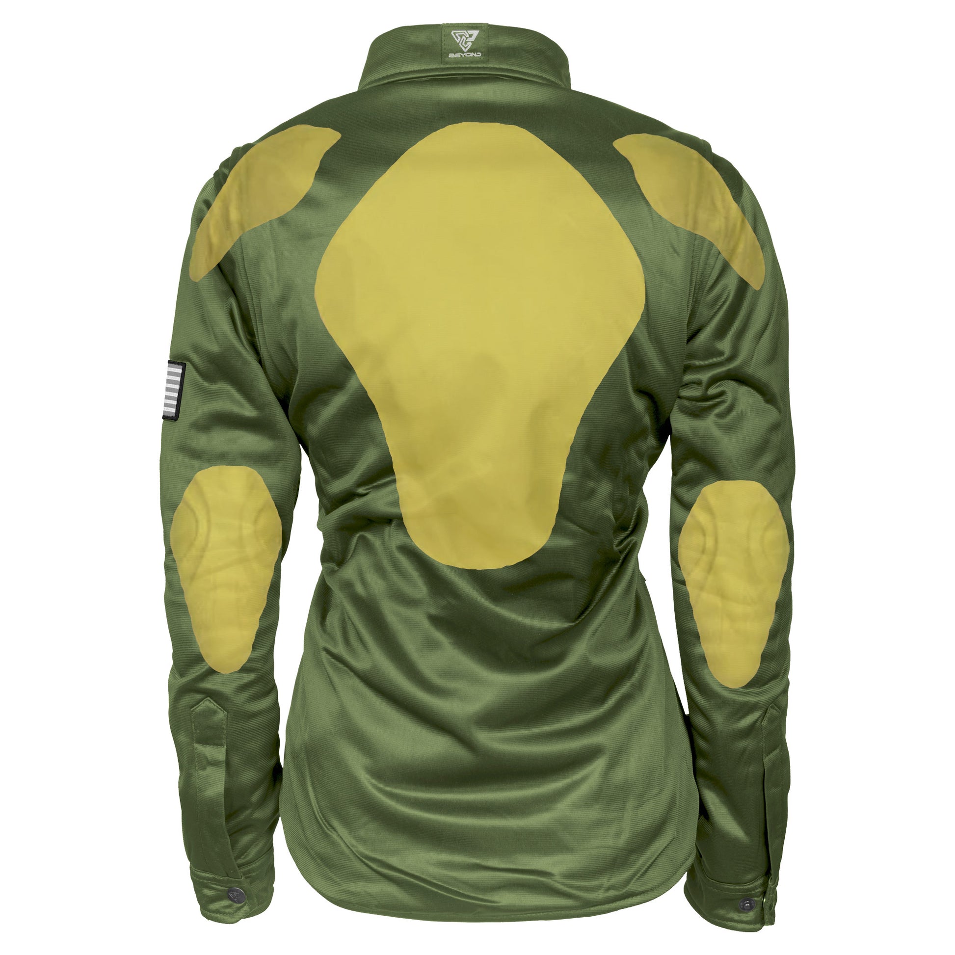 Embark on your next adventure with confidence in the Women's Army Green Solid Ultra Protective Shirt with Level 1 pads included. Ideal for riders who value both safety and style, this shirt by Beyond Riders is perfect for urban commutes and countryside escapes alike. Offering unmatched protection and a sleek design, it caters to those who seek to fuse superior motorcycle gear with the versatility required for personal electric vehicles.